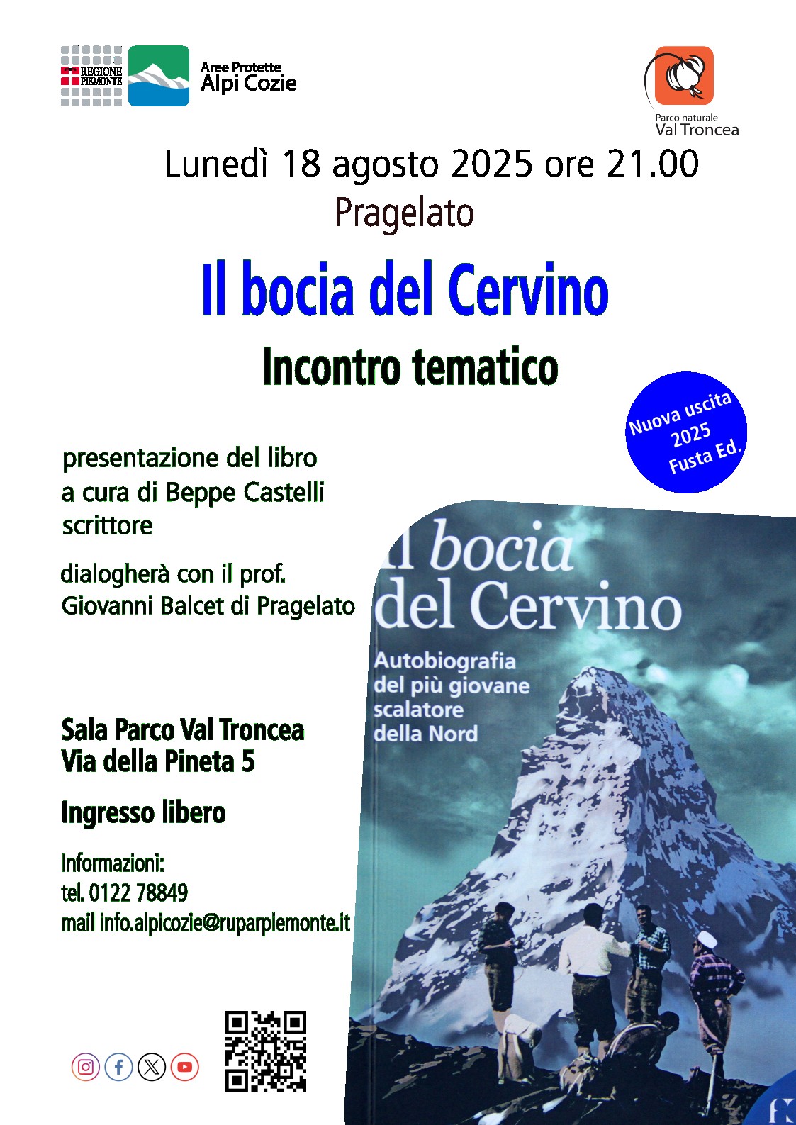 Lunedì 18 agosto a Pragelato, sede del Parco naturale Val Troncea, via della Pineta frazione La Ruà alle ore 21, presentazione libro ”Il Bocia del Cervino”.