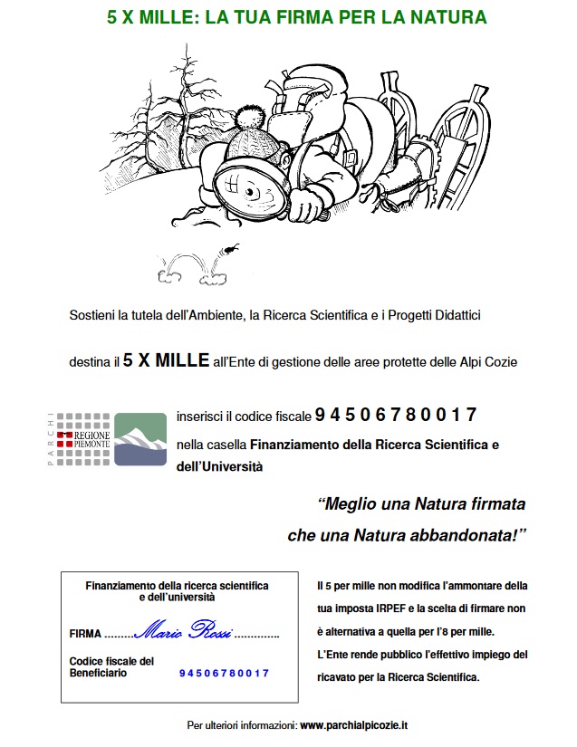Anche tu puoi sostenere la Tutela dell'Ambiente, la Ricerca Scientifica e i Progetti Didattici dei Parchi Alpi Cozie donando il tuo 5x1000 all'Ente di gestione delle aree protette delle Alpi Cozie.