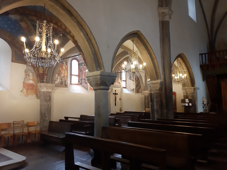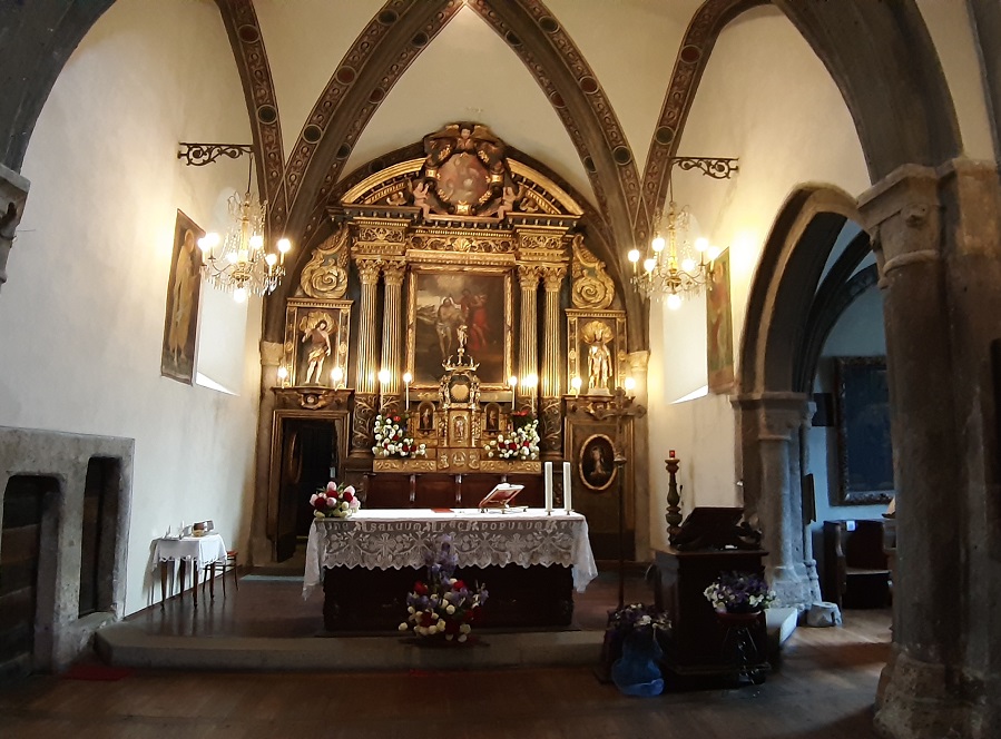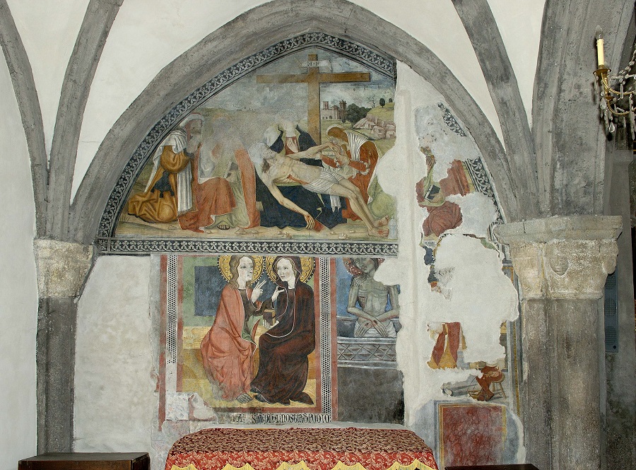 The interior walls of the church are decorated with interesting sixteenth-century frescoes, expressions of lively folk art that have survived moisture infiltrations and the ravages of time, appearing deeply chiseled.