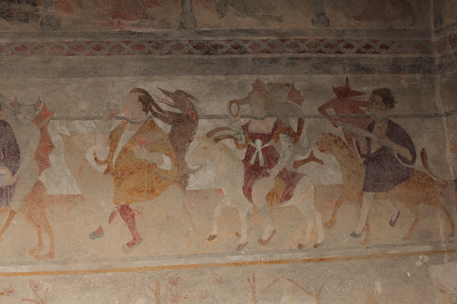 On the right side of the church, there are traces of ancient frescoes: as a warning for the faithful and travelers, a series of Virtues, Vices, and corresponding Infernal Punishments were painted on three bands.