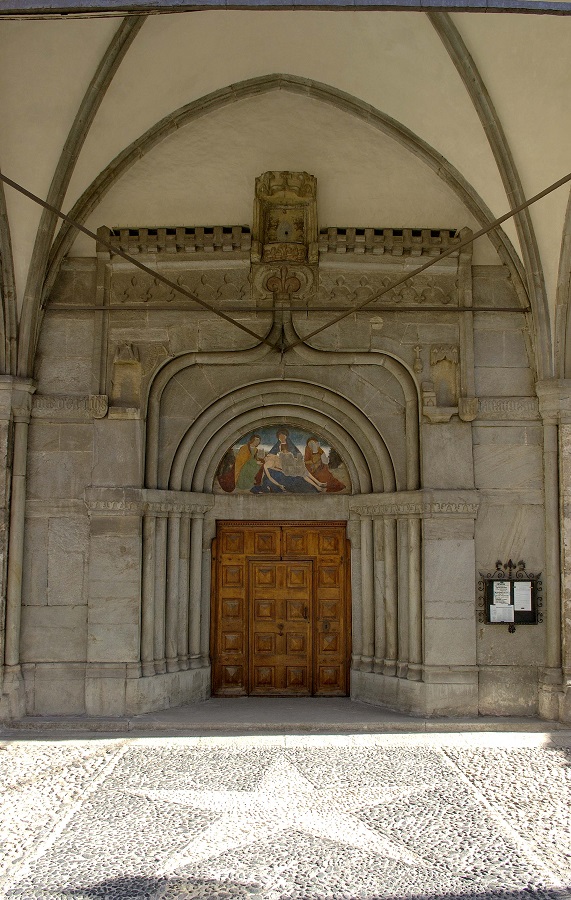 The portal, carved in living stone, is dominated by a misaligned arch in Lombard Romanesque style, which extends semi-circularly above the lintel, framing the lunette where a Deposition from the Cross is frescoed.