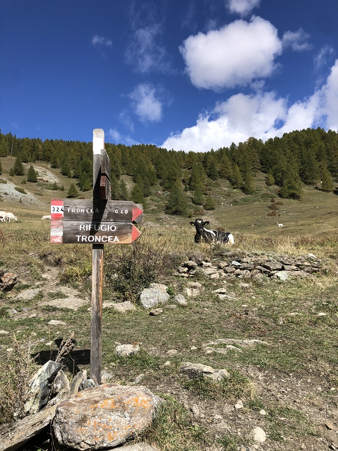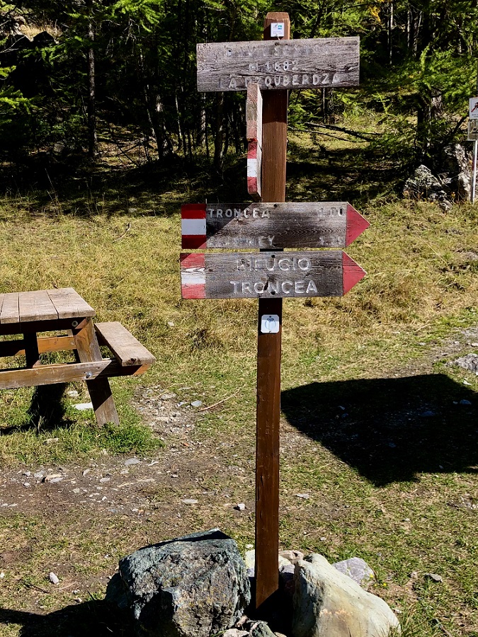 Ol tratto iniziale si presenta in salita e sotto un lariceto per circa mezz’ora, togliendo così la gran parte del dislivello. Terminata la salita si giunge alla Località Seytes, con resti di edifici ormai abbandonati e uno in ristrutturazione. Da qui, seguendo le indicazioni del cartello (foto 2) si prosegue a mezza costa fino a Troncea, passando tra zone più ombreggiate e boschive ad altre più soleggiate e aperte. Questo tratto è quasi pianeggiante, alternato da piccoli rii, alcuni asciutti altri no. Poco prima della località Troncea vi è un bivio, da qui volendo si può continuare per Colle del Beth, Colle dell’Arcano e Ghinivert.