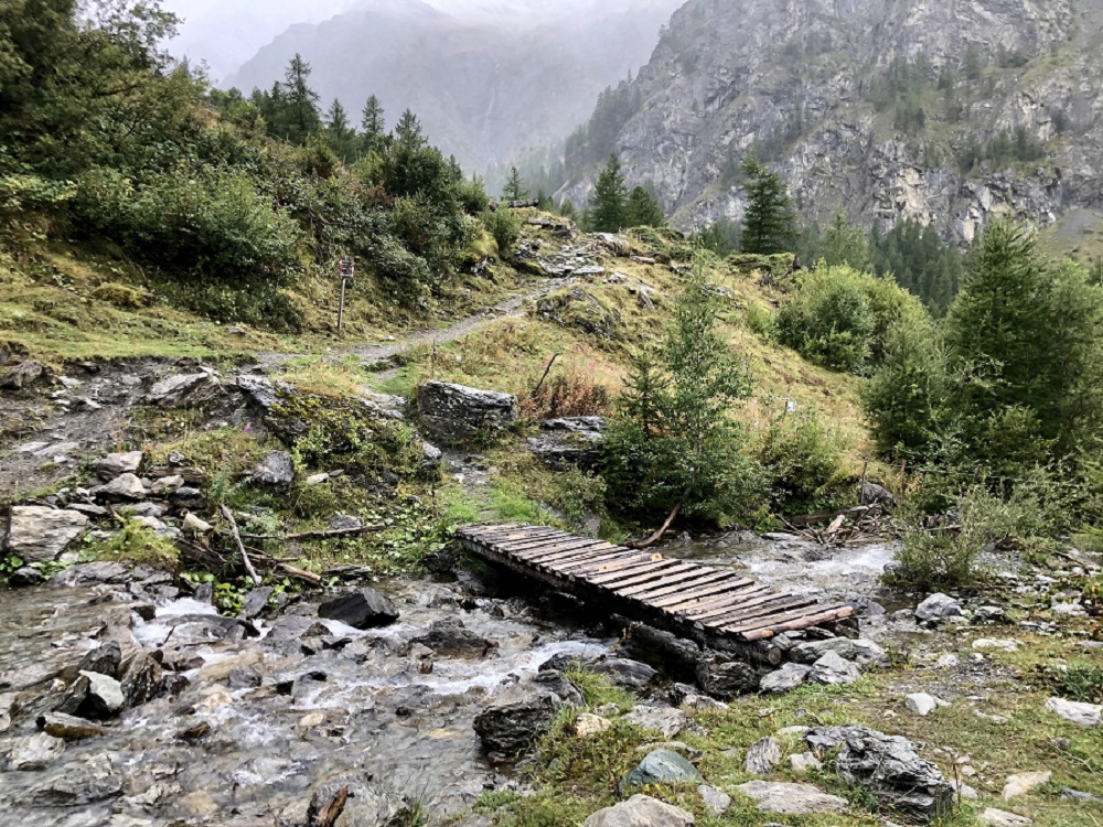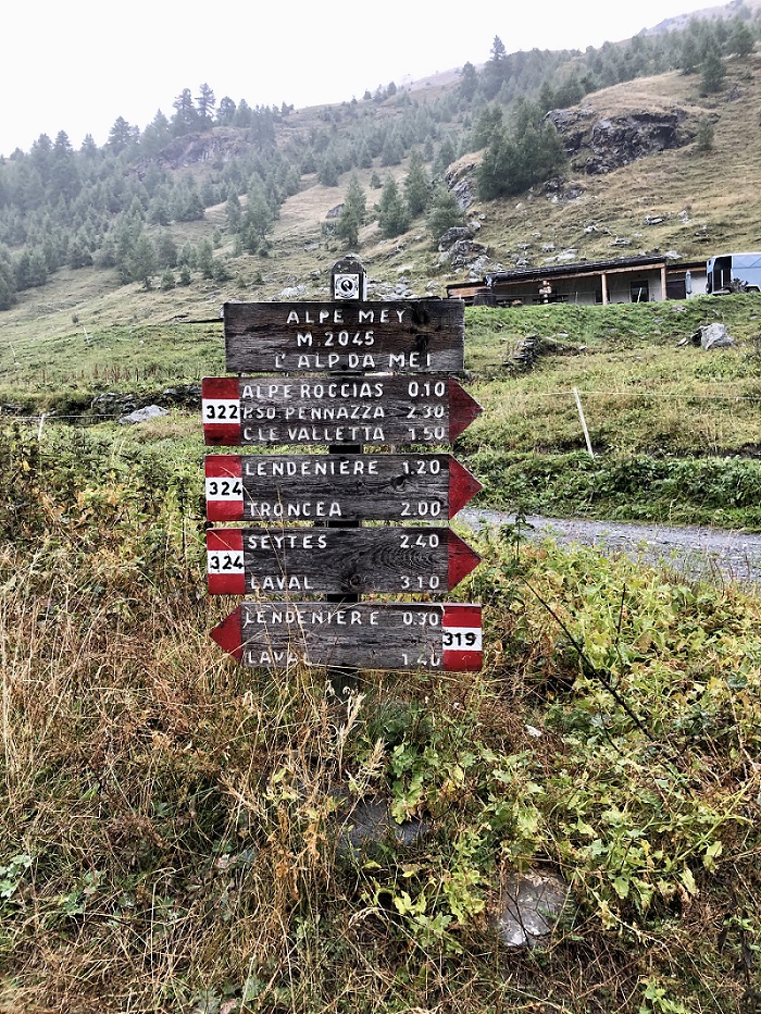 Giunti a Troncea, dove si trova l’omonimo rifugio e l’alpeggio dove acquistare il formaggio, si prosegue in direzione Alpe Mey. (foto 3). Il sentiero da qui in poi continua sempre alternando zone di bosco a pascoli, con pendenze dolci caratterizzate dall’attraversamento di altri rii. Il primo di questi presenta una passerella in legno la quale richiede solo un po’ di premura nell’attraversamento in quanto spesso bagnata. In questo punto è possibile, in 5 minuti, visitare la lapide ai minatori oppure scendere in Lendiniere, perdendosi però così il secondo alpeggio. (foto 4)