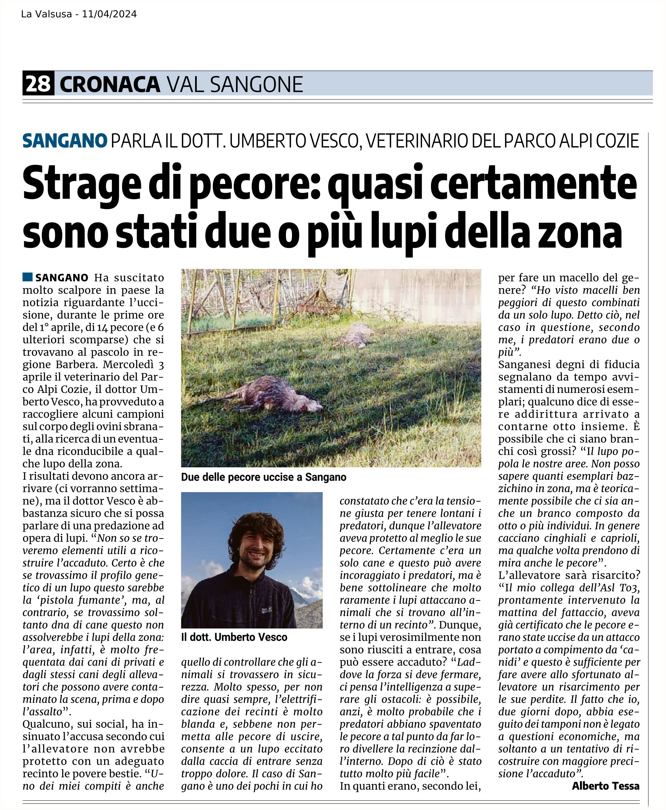 Strage di pecore: quasi certamente sono stati due o più lupi della zona