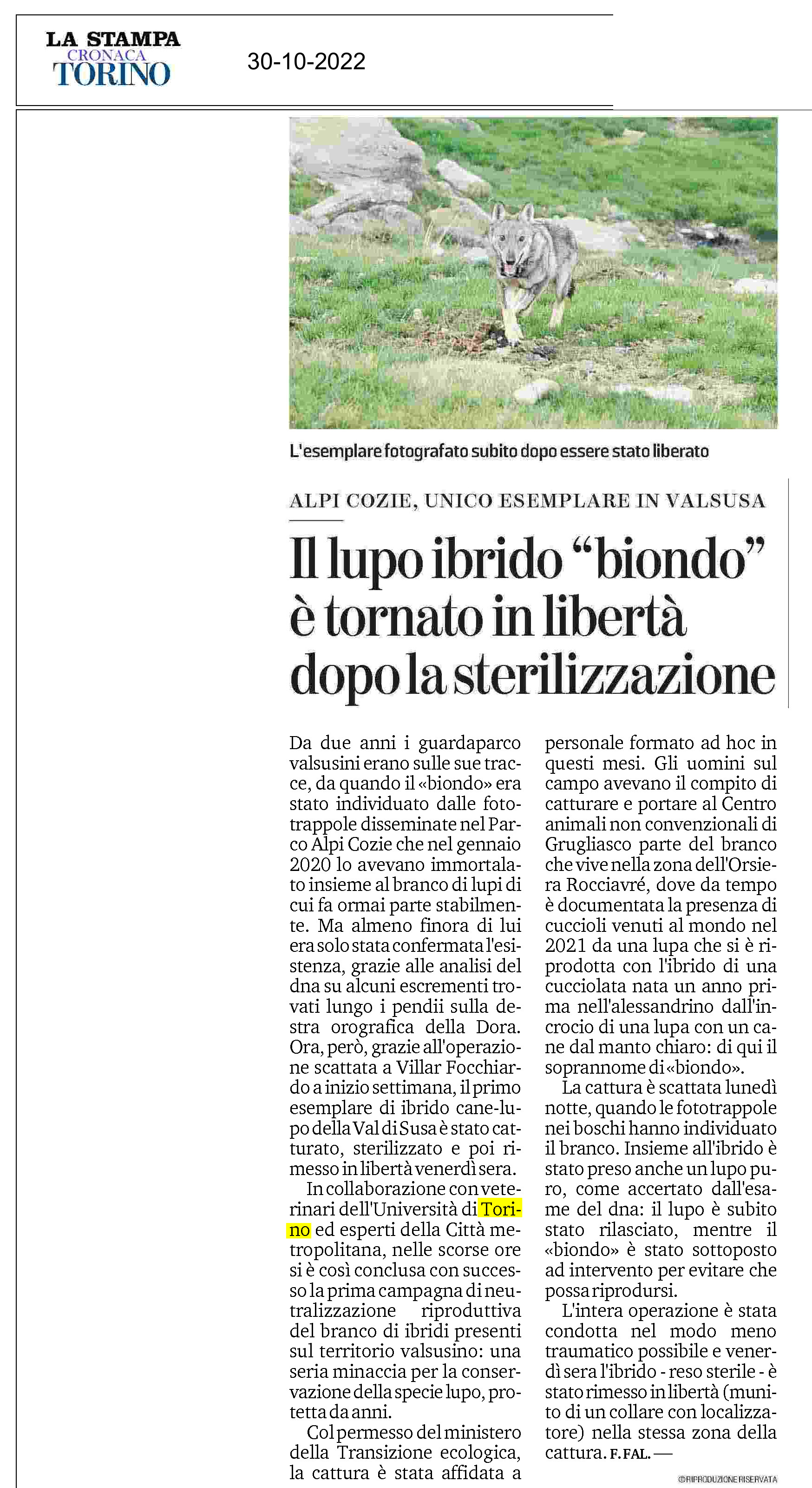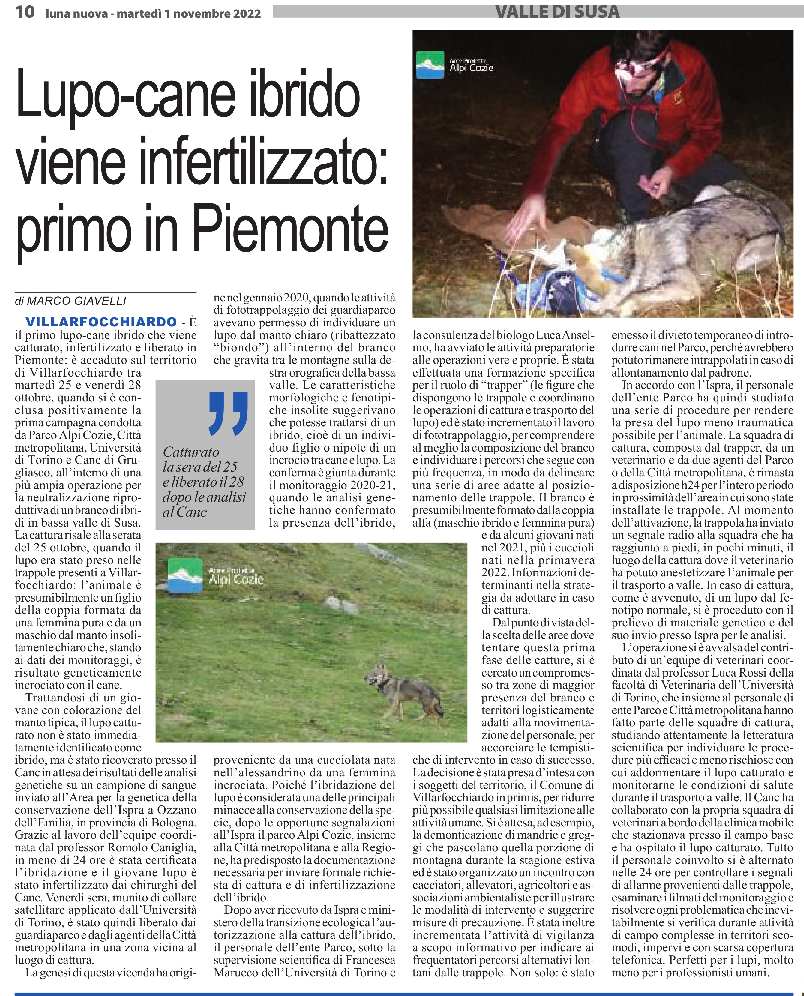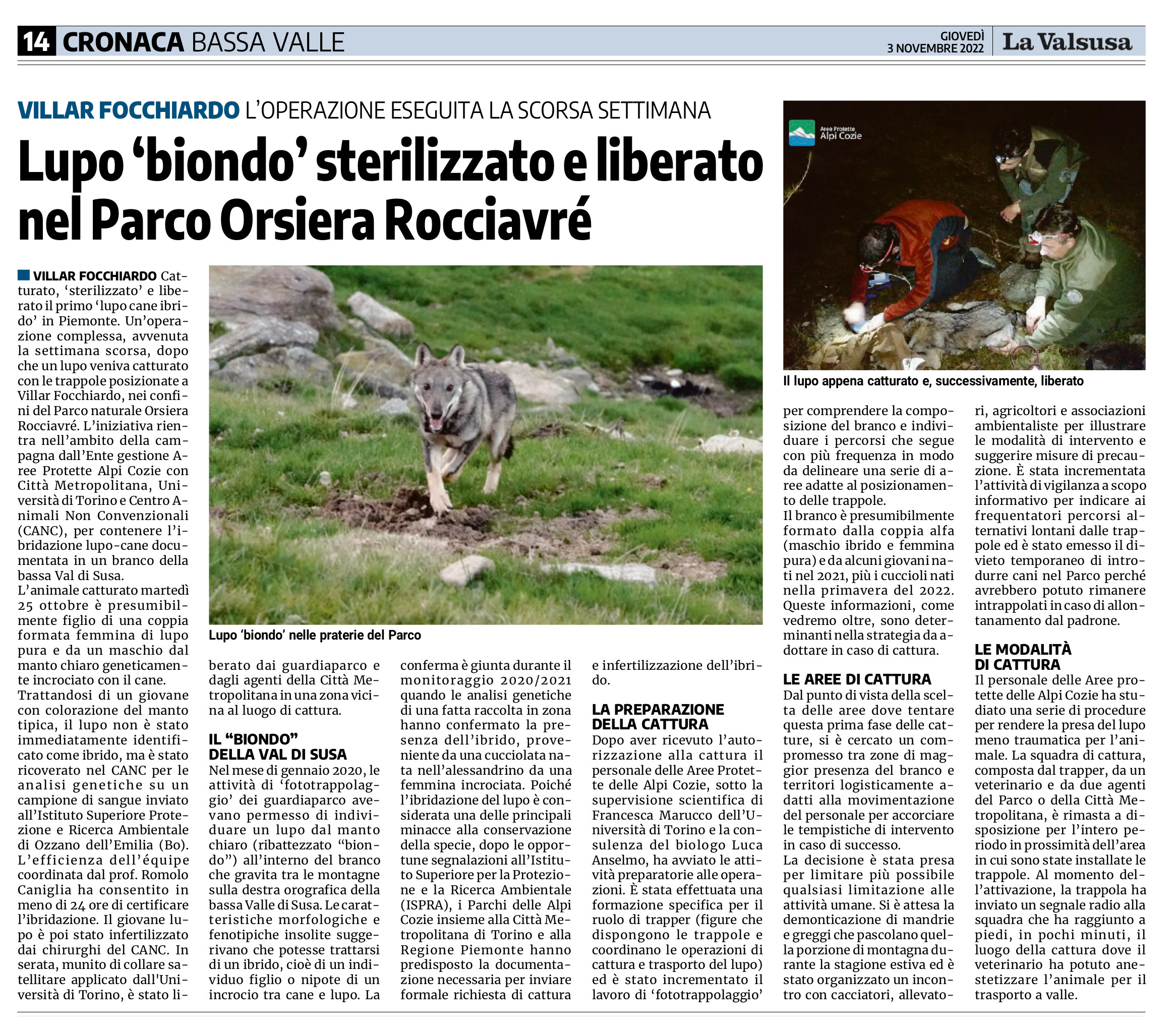 Lupo ‘biondo’ sterilizzato e liberato nel Parco Orsiera Rocciavré