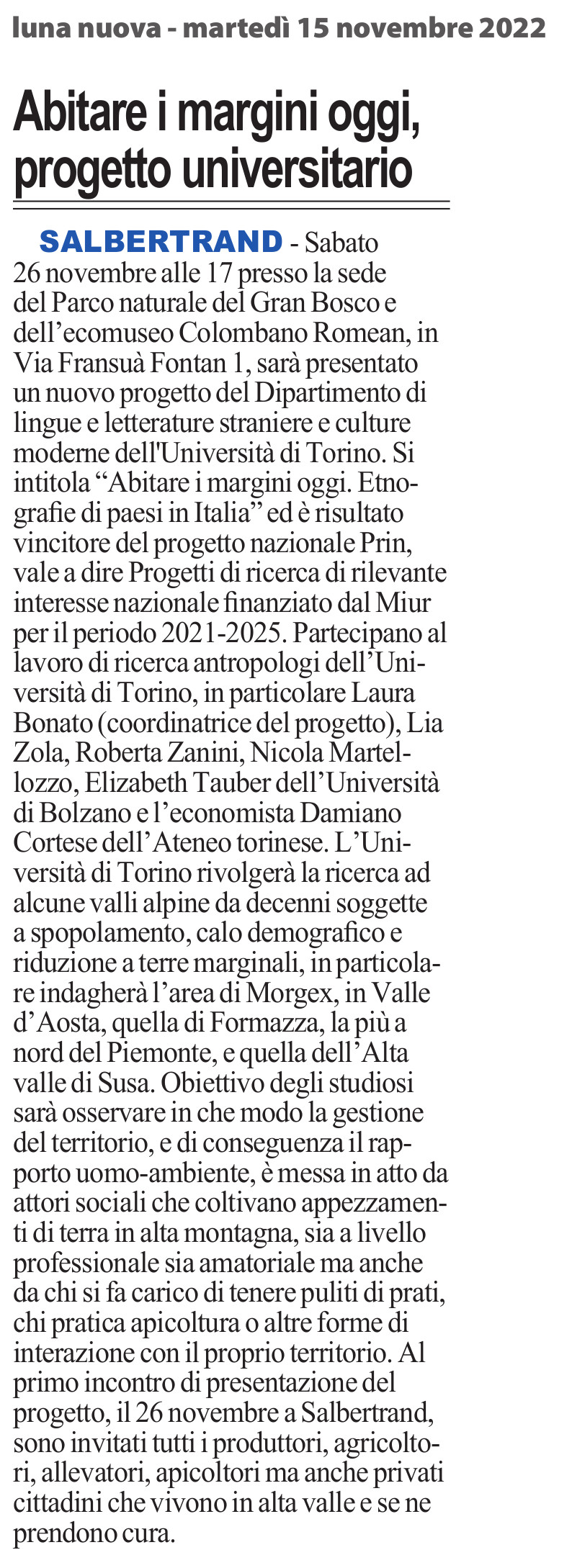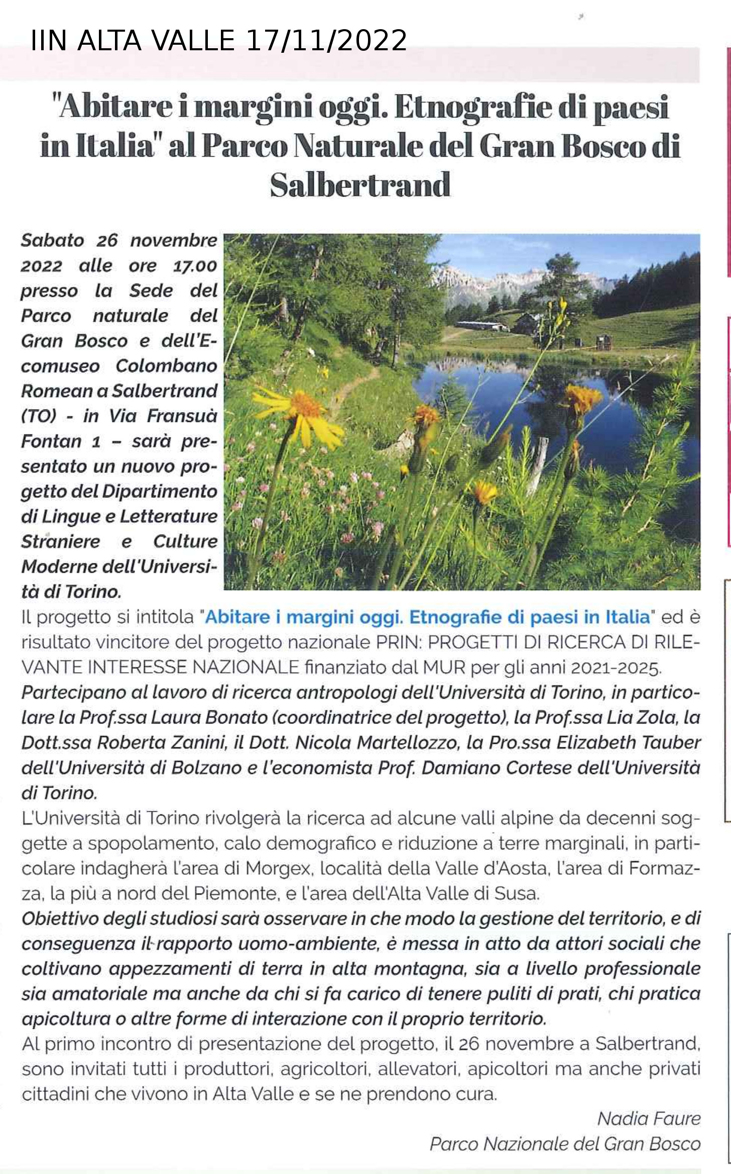 "Abitare i margini oggi". Etnografie di paesi in Italia" al Parco Naturale del Gran Bosco di Salbertrand