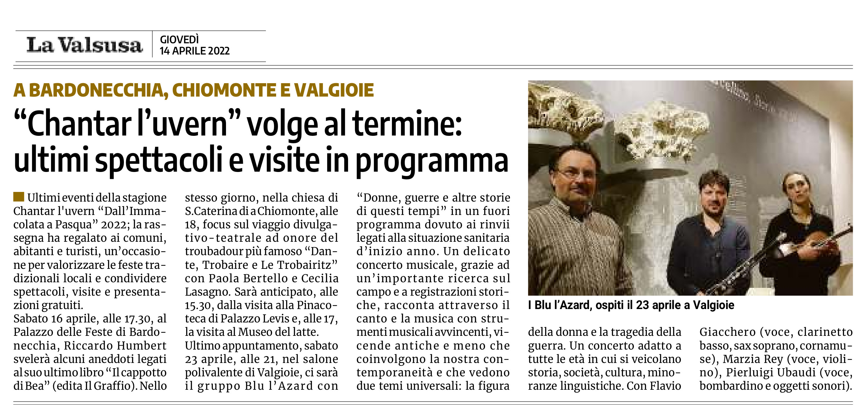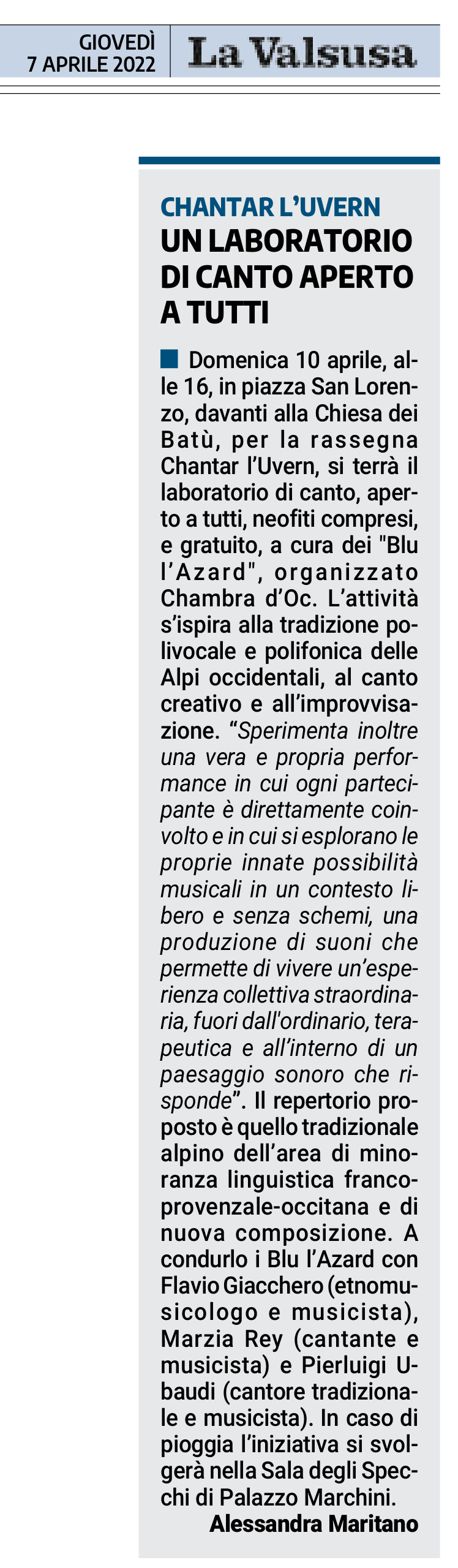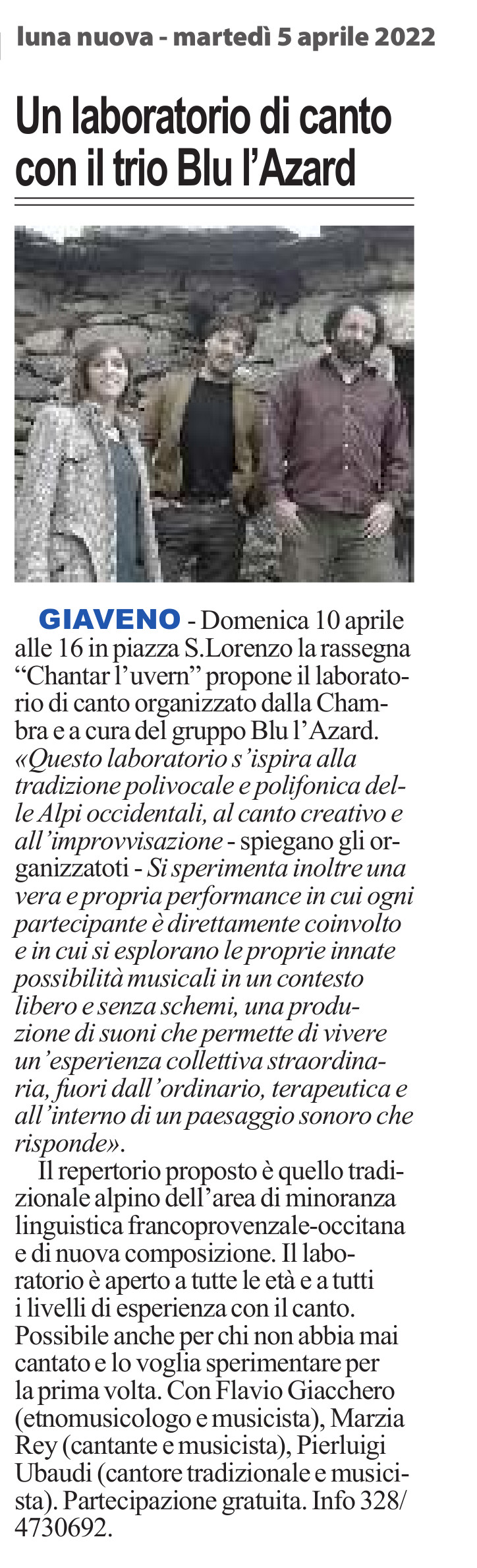 Un laboratorio di canto con il trio Blu l’Azard