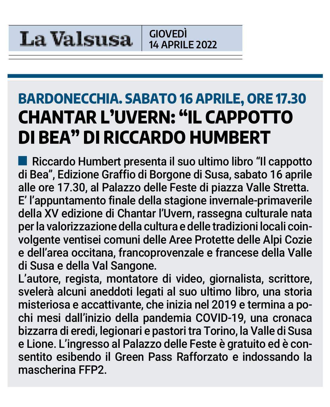 Chantar l’Uvern: “Il cappotto di Bea” di Riccardo Humbert
