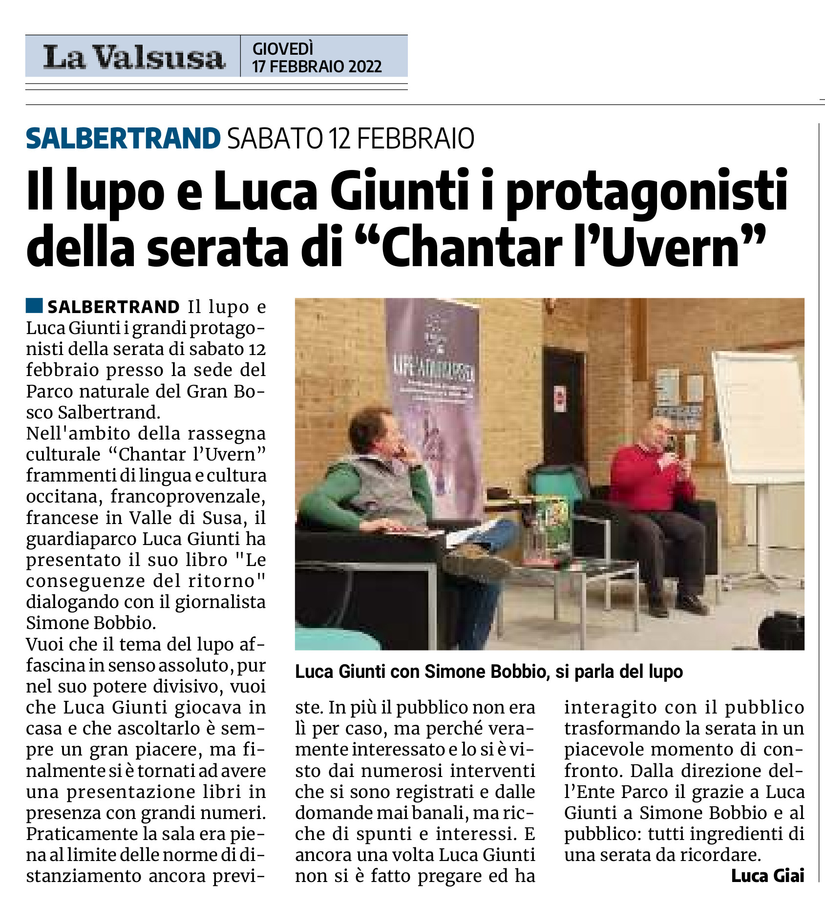 Il lupo e Luca Giunti i protagonisti della serata di “Chantar l’Uvern”