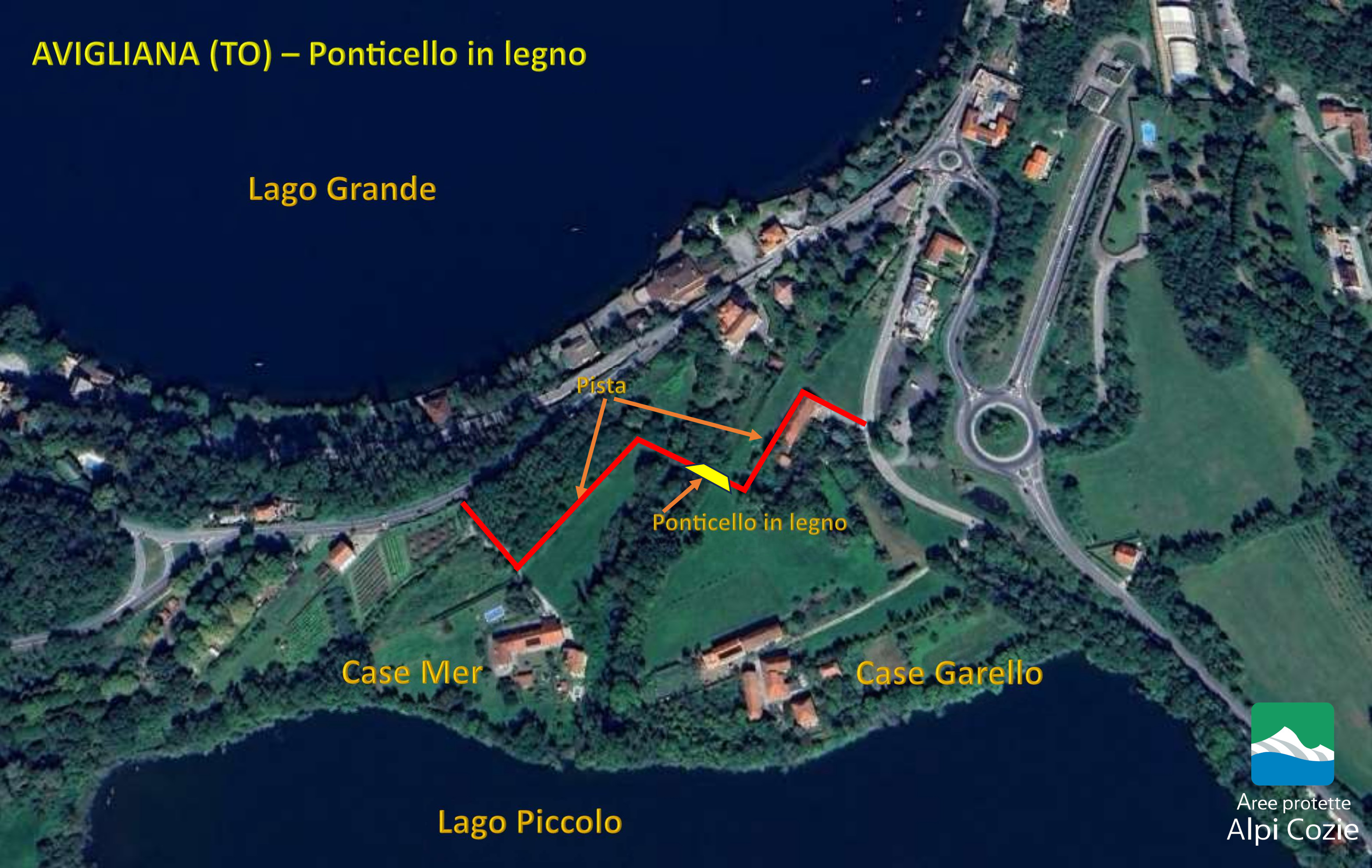 Il est signalé que la commune d'Avigliana a interdit le passage sur la passerelle cyclo-piétonne qui traverse le Rio Meana entre le Lac Petit et le Lac Grand dans le Parc Naturel des Lacs d'Avigliana. Cette mesure a été prise par arrêté n° 29 du 19 février 2025 car, pour des raisons de sécurité publique, il n'est plus possible de garantir le passage en toute sécurité sur le pont en bois. Pour tous ceux qui empruntent les sentiers le long des lacs, il suffit d'un court détour par la via Giaveno et la via Pinerolo, ce qui permet de contourner l'obstacle du pont fermé sans interrompre le parcours en boucle du Lac Petit.