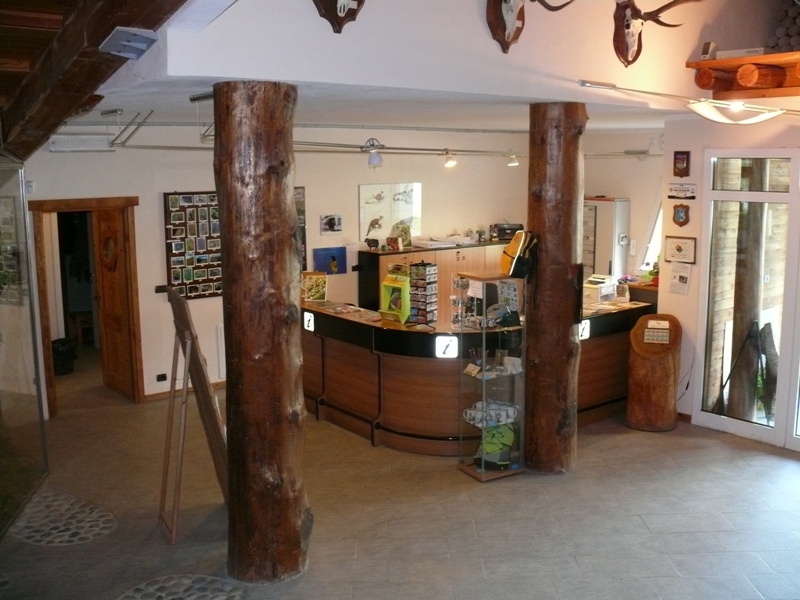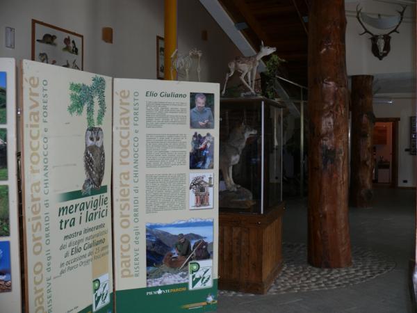 L'espace d'exposition rappelle la forêt, environnement dominant du Parc, avec quatre piliers en mélèze brut local et l'escalier en mélèze avec des marches larges et une structure carrée; il y a plusieurs dioramas installés (la vitrine des rapaces diurnes et nocturnes, la vitrine éducative sur l'avifaune du Parc, des passereaux aux rapaces, et, dans le long sous-escalier, le diorama de l'environnement alpin, des prairies d'altitude à la forêt, des buissons au lit de la rivière) et une riche exposition de trophées de cerf et de artefacts. Un totem interactif permet d'écouter les cris des animaux sauvages.