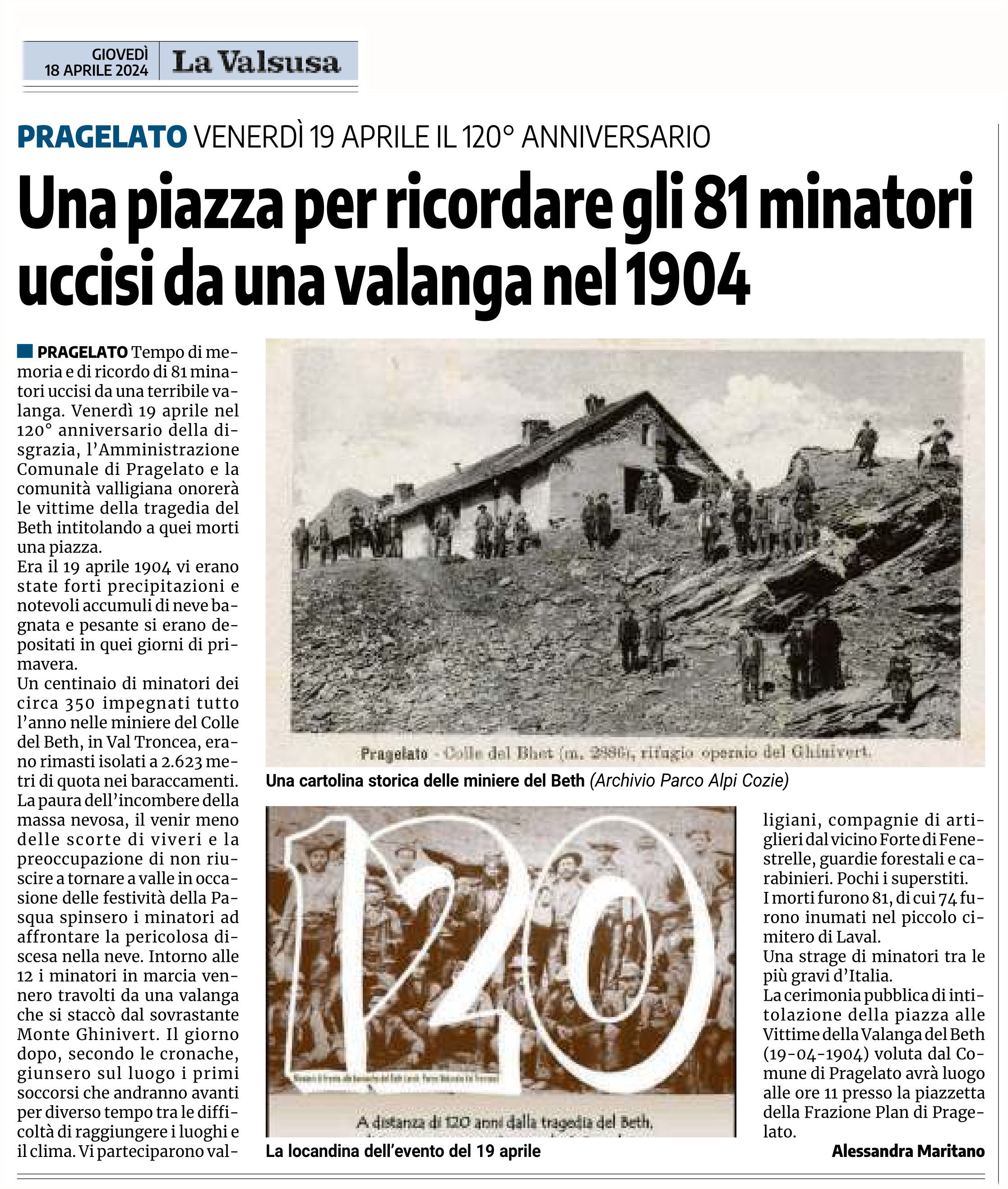 Una piazza per ricordare gli 81 minatori uccisi da una valanga nel 1904