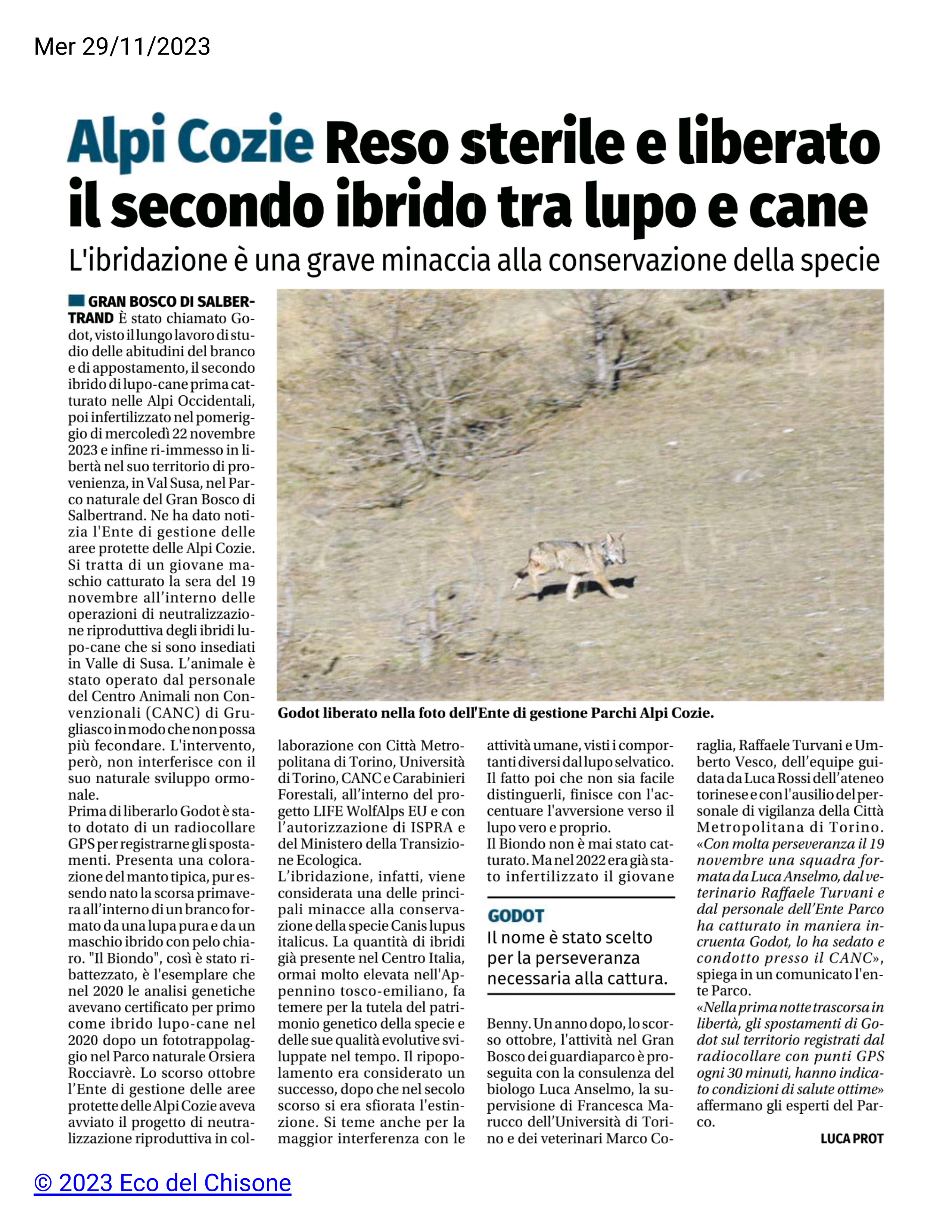 Reso sterile e liberato il secondo ibrido tra lupo e cane