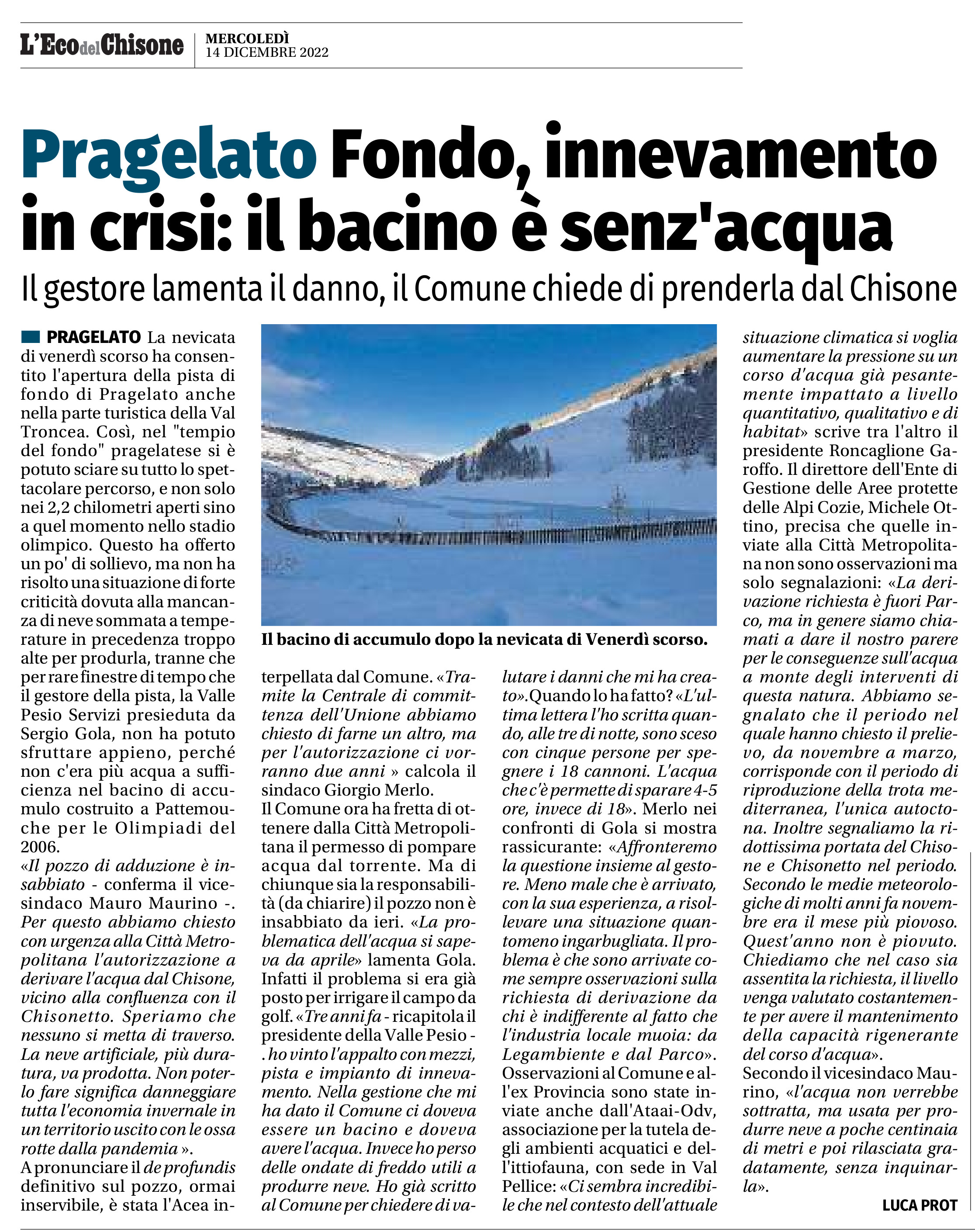 Pragelato Fondo, innevamento in crisi: il bacino è senz'acqua