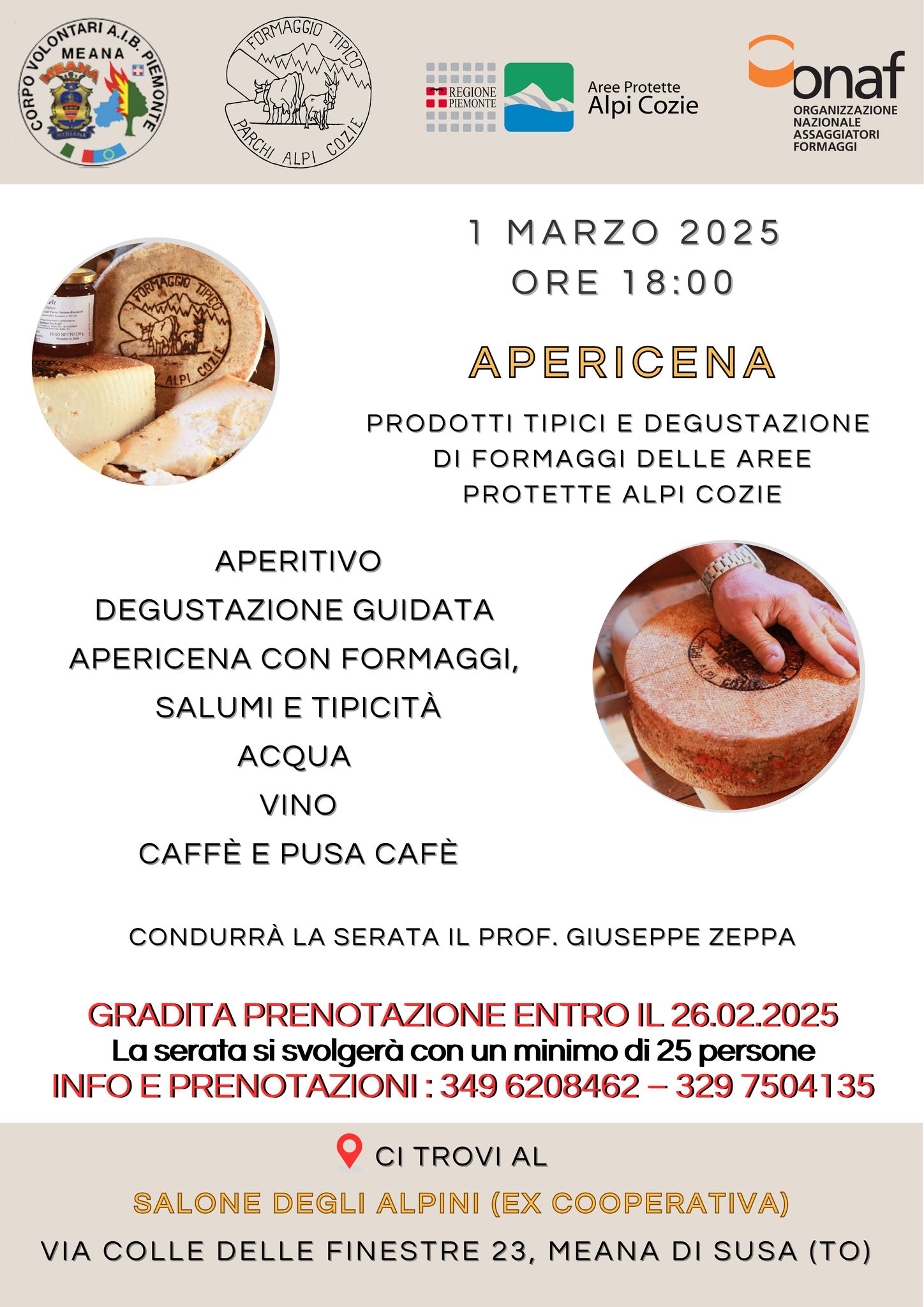 Sabato 1 marzo, alle ore 18.00, a Meana di Susa presso il Salone degli Alpini via Colle delle Finestre 23, apericena a base di prodotti tipici e degustazione di formaggi delle aree protette Alpi Cozie.
