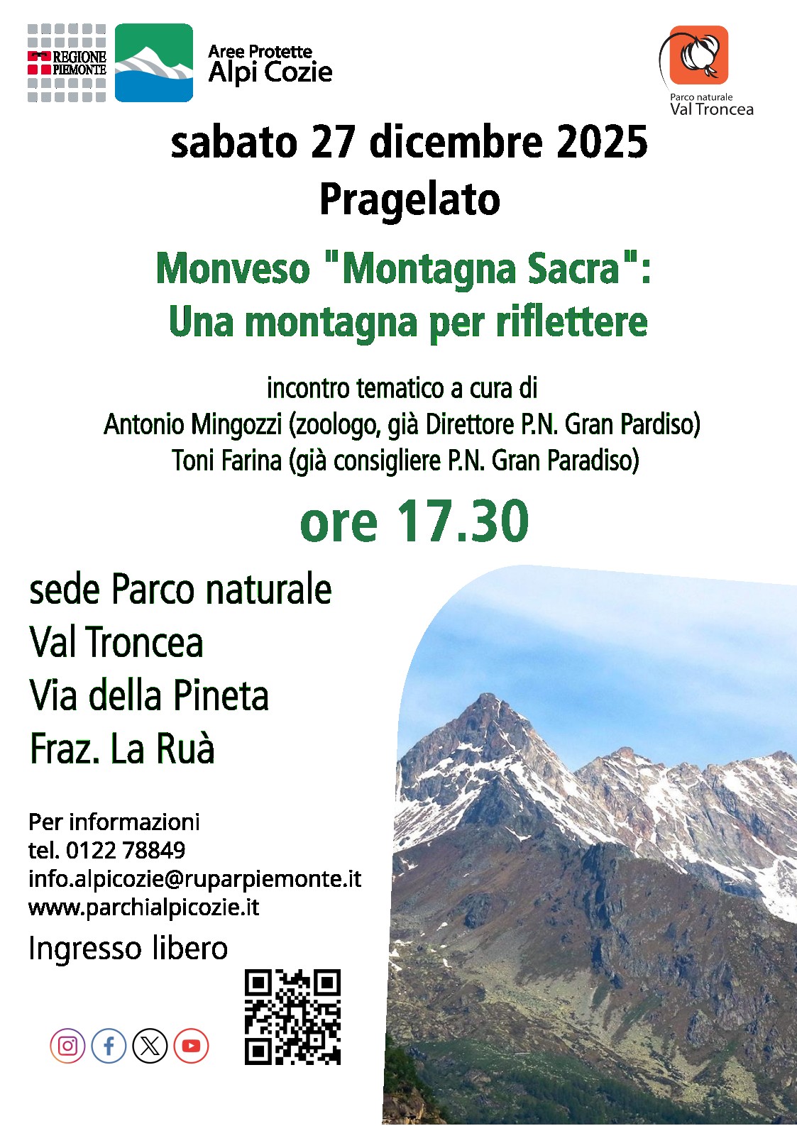 Sabato 27 dicembre ore 17.30 a Pragelato, sede Parco naturale della Val Troncea, via della Pineta Frazione La Ruà, Antonio Mingozzi (ex direttore del Parco nazionale del Gran Paradiso) e Toni Farina (già consigliere del Parco nazionale del Gran Paradiso) presentano Monveso Montagna Sacra.