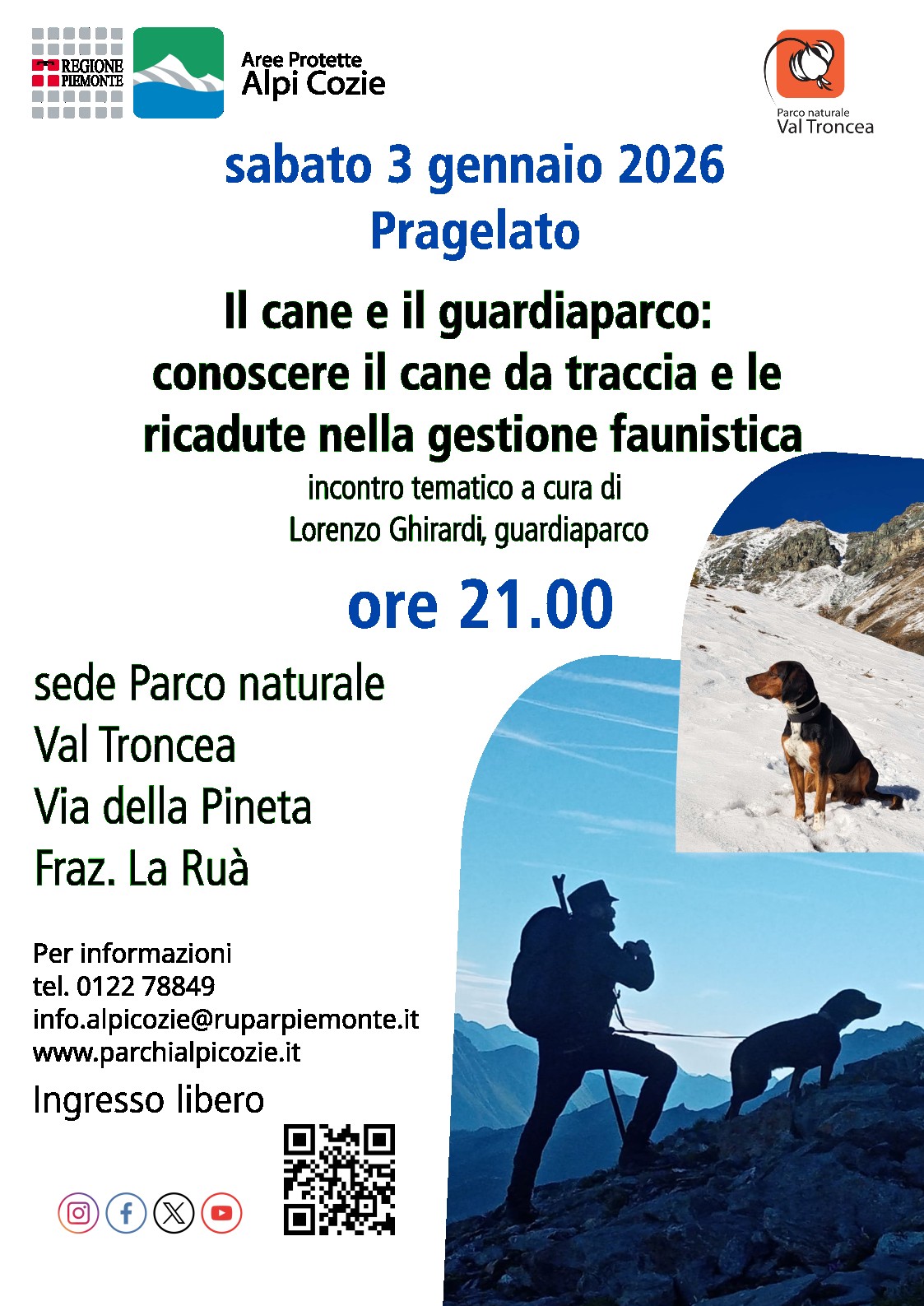 Sabato 3 gennaio 2026 ore 21 a Pragelato, sede Parco naturale della Val Troncea, Via della Pineta Frazione La Ruà, incontro tematico con il guardiaparco Lorenzo Ghirardi per conoscere il cane da traccia e le ricadute sulla gestione faunistica