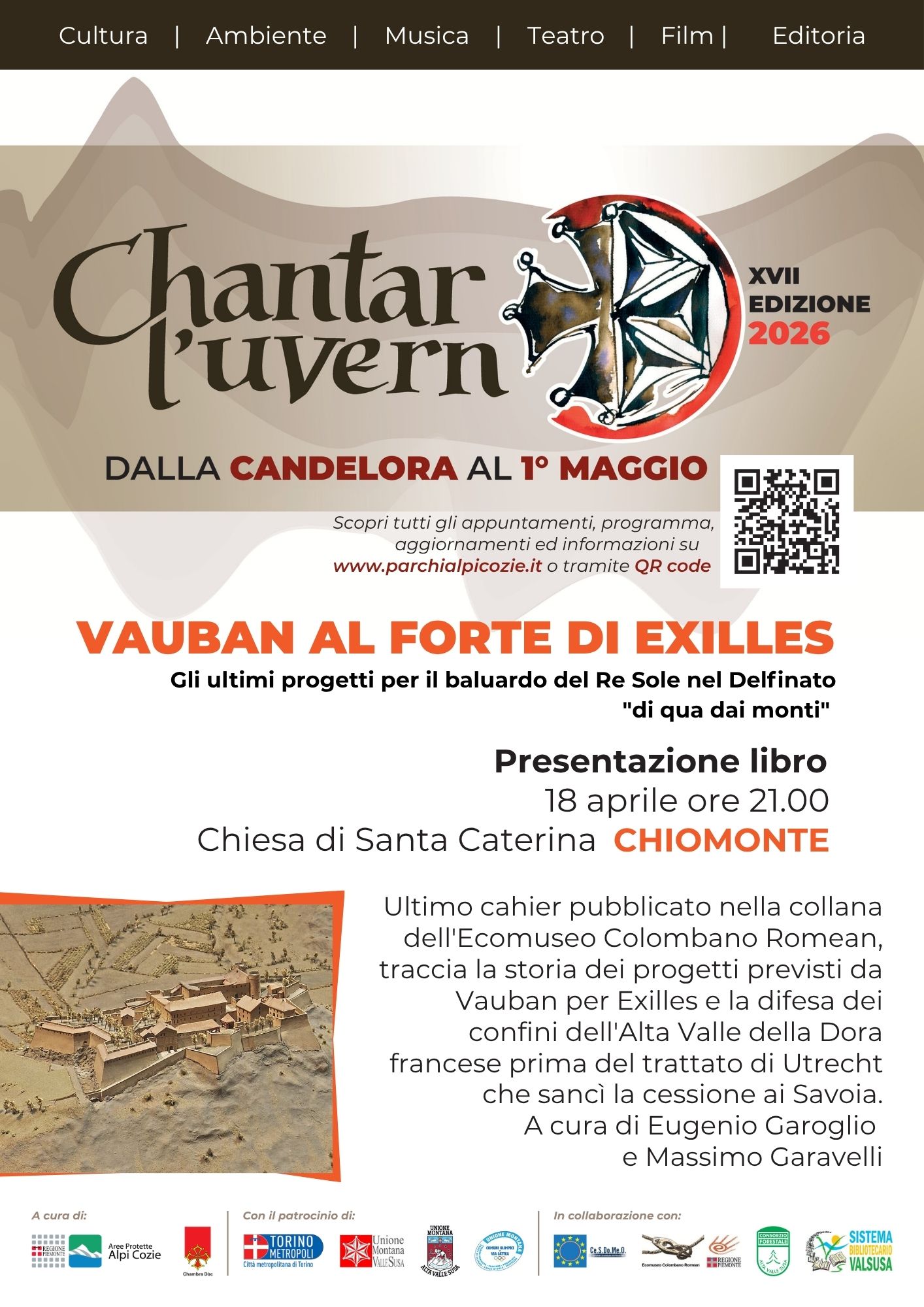 Sabato 18 aprile ore 21 a Chiomonte presso chiesa di Santa Caterina in via Vescovado, presentazione del cahier dell'Ecomuseo Colombano Romean n. 34 Vauban al Forte di Exilles Gli ultimi progetti per il baluardo del Re Sole nel Delfinato "di qua dai monti" a cura di Eugenio Garoglio e Massimo Garavelli.