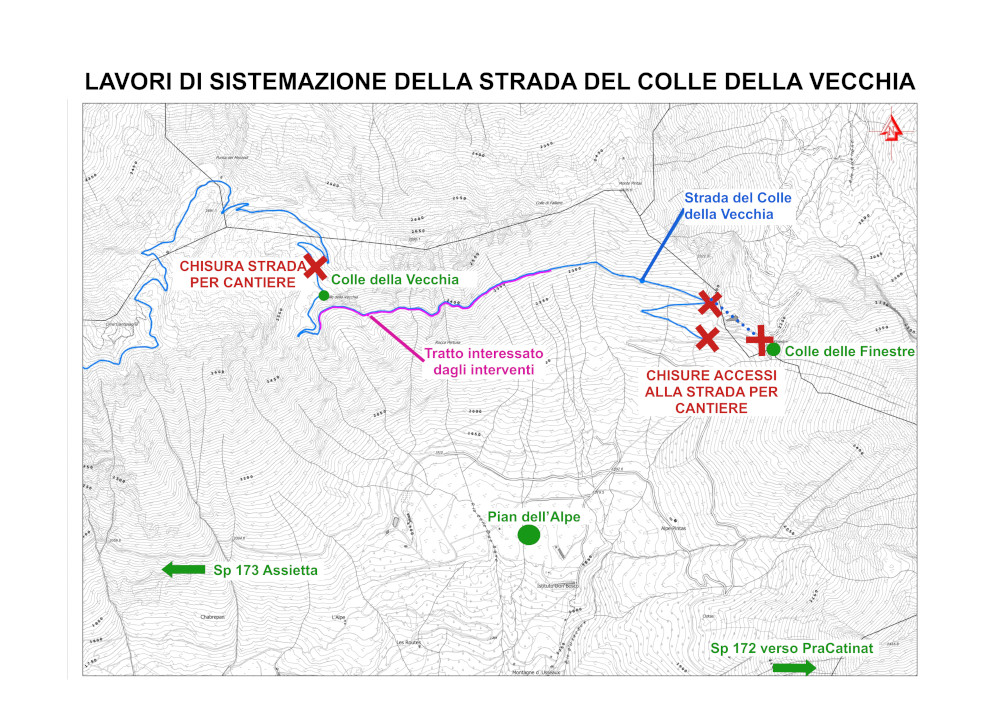 I lavori di ripristino della strada riguarderanno gran parte dell’itinerario tra il Colle delle Finestre e il Colle della Vecchia per consentire l’accesso ai mezzi in grado di operare sulla frana e per la successiva ricostruzione dei muri di contenimento. L’intera sede stradale necessiterà quindi di una messa in sicurezza e verrà chiusa a qualsiasi tipologia di frequentazione. Inoltre, solo dopo l’inizio dei lavori veri e propri nella zona dello smottamento, verranno valutate ulteriori chiusure temporanee della SP173 in zona Pian dell’Alpe nelle giornate in cui si effettueranno i disgaggi che potrebbero provocare la caduta di massi lungo l’intero versante sottostante.