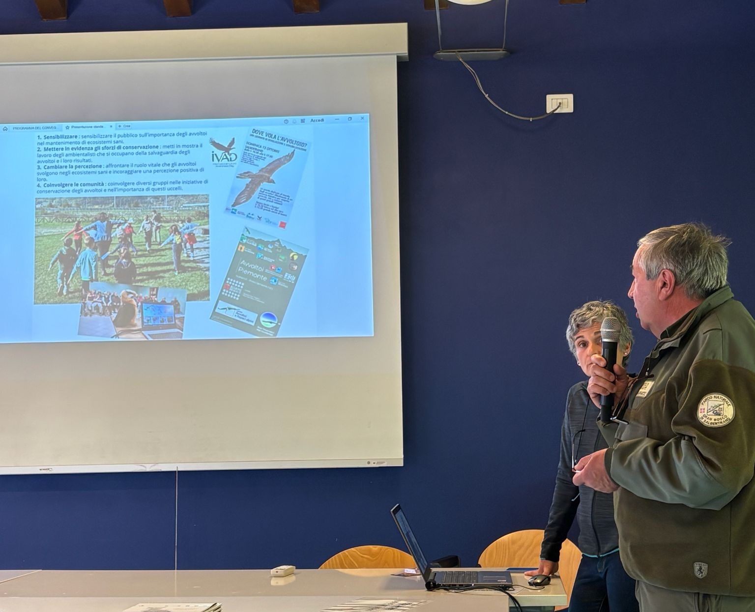 Giuseppe Roux Poignant, referente del Progetto Gipeto per i Parchi Alpi Cozie ha illustrato la situazione nei nostri parchi, con particolare attenzione alla stagione riproduttiva 2025 che ha visto due coppie nidificanti ma nessun pullo involato, ha illustrato l'andamento della IOD 2025, giornata di osservazione in contemporanea, che ha coinvolto 63 operatori, dei quali più della metà volontari, su 34 postazioni (19 in Valle di Susa e 15 tra Valle Chisone e Germanasca) con 21 eventi di osservazione e 12 individui differenti riconosciuti; ha raccontato della prima edizione dell'IVAD International Vulture Awareness Day, giornata di divulgazione e sensibilizzazione sugli avvoltoi svoltasi con grande successo a Salbertrand il 20 ottobre scorso.