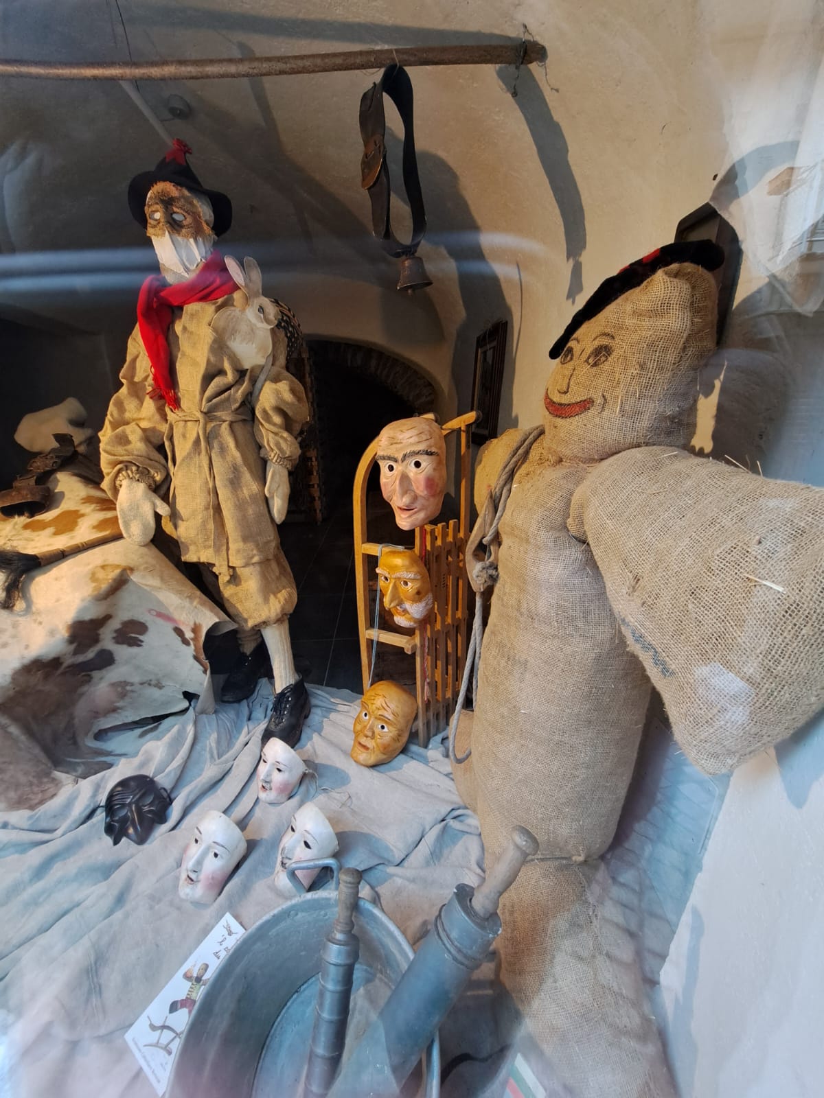 Nella vetrina dell’Hotel Dieu, la maschera del Carnevale e della mucca, insieme all’aratro, ricordano il rito dell’aratura della neve tradizionalmente interpretata da due uomini con maschere animali, pelli di vacca sulle spalle, aggiogati ad un aratro guidati da un aratore, con sua moglie, la massaia, la menajeä, che seminava e i bambini che seguivano e coprivano il solco. Un gesto che rappresentava il processo evolutivo di fertilizzazione simbolica della terra. Riti antichi di un tempo festivo ciclico che scandiva il ritorno della luce dopo il buio dell’inverno e che celebrava il risveglio della natura.