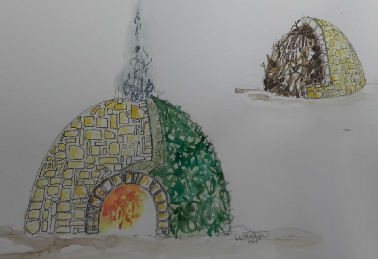 Preparazione fornace per la cottura della calce - Disegno di Elio Giuliano