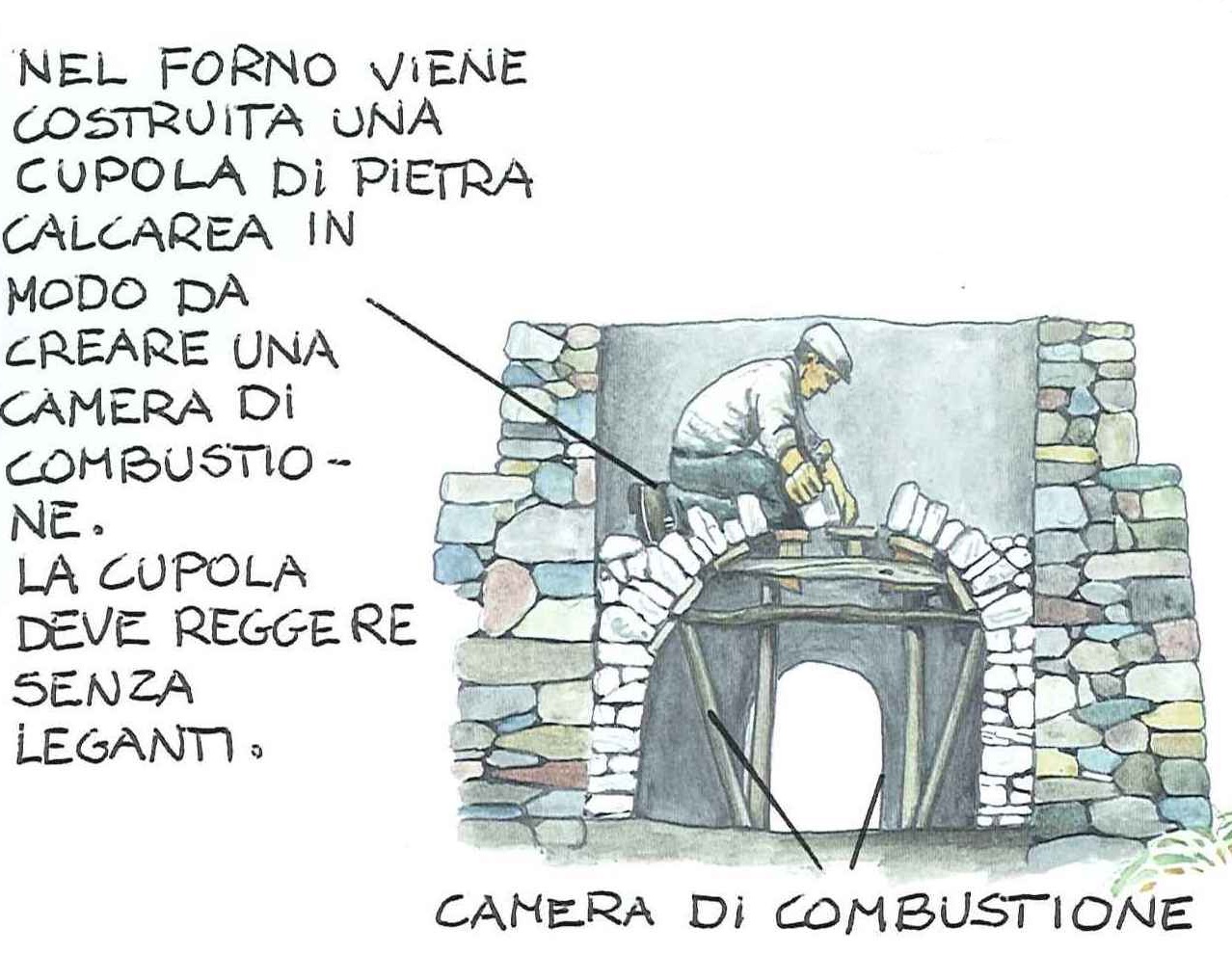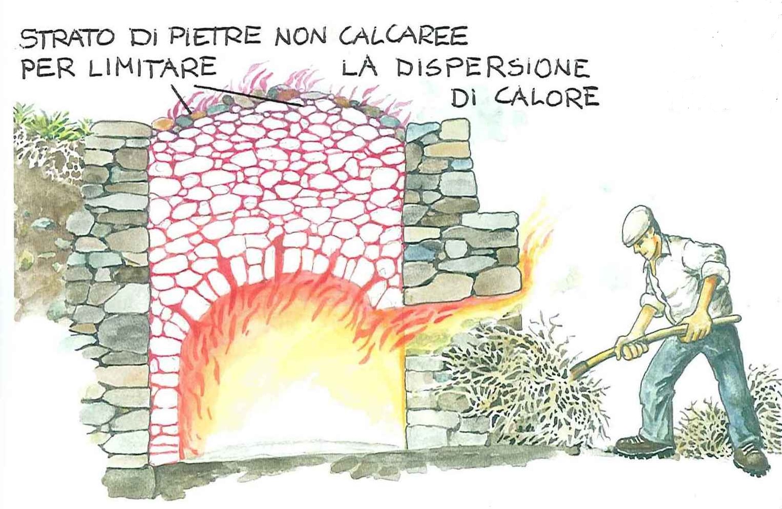 Più in quota, si utilizzava una tecnica simile a quella per la preparazione del carbone. Si creava uno spiazzo di 2-3 m di diametro e vi si accatastava una gran quantità di legna su cui si costruiva una cupola con pietre da calce utilizzando i frammenti più piccoli per tappare gli interstizi.