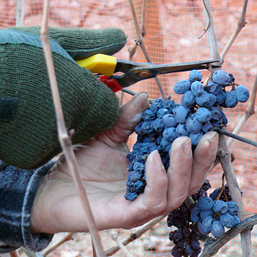 Le uve vengono lasciate sui tralci fino all’inverno, la vendemmia viene fatta a meno 8°, di solito la notte o la mattina presto, manualmente, com’è tradizione e come previsto dal disciplinare.
