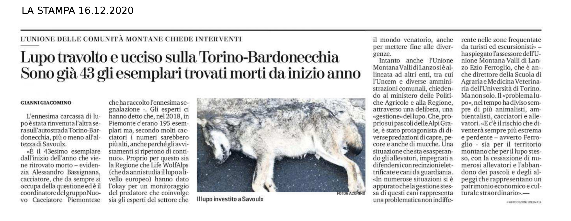 Lupo travolto e ucciso sulla Torino-Bardonecchia. Sono già 43 gli esemplari trovati morti da inizio anno