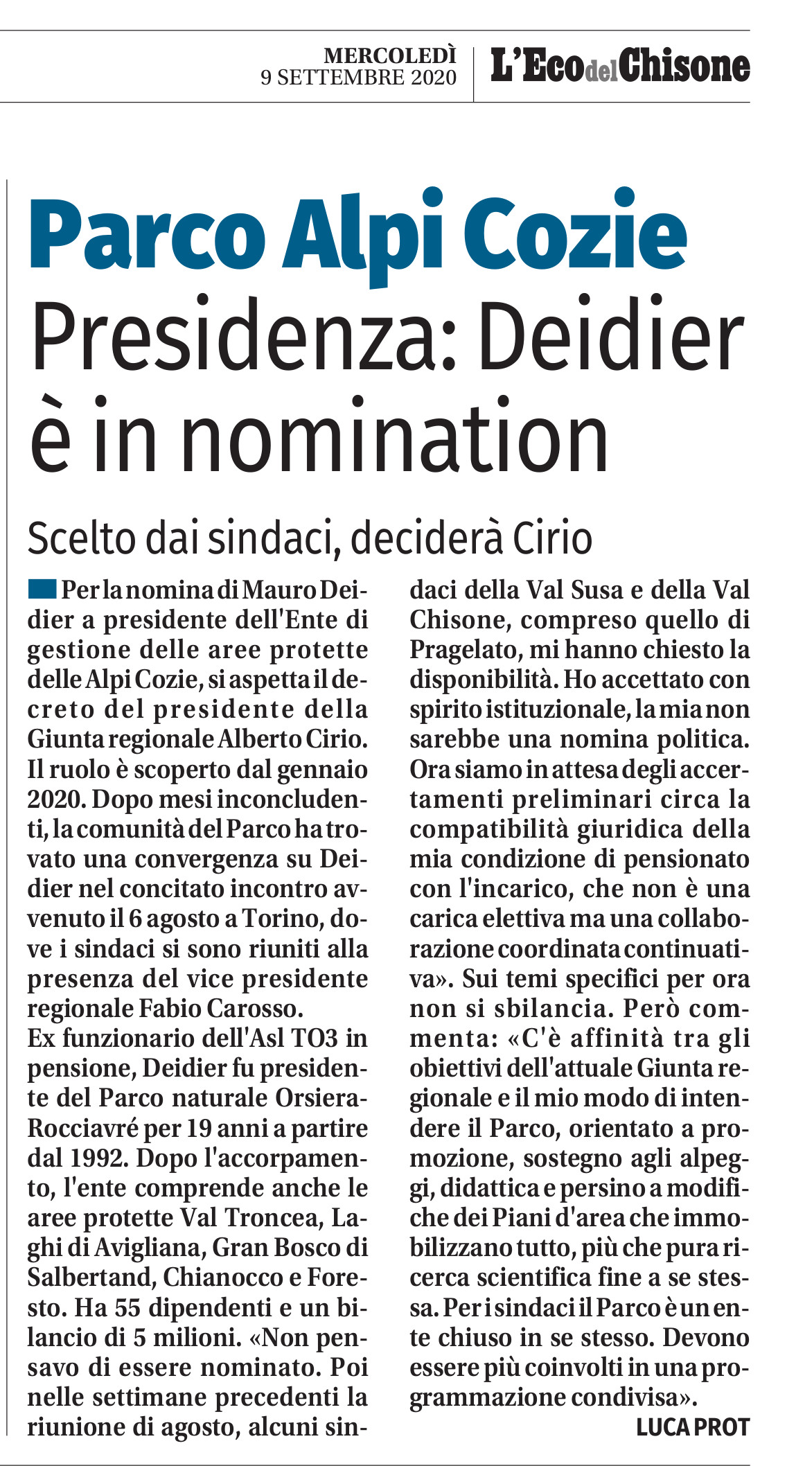 Parco Alpi Cozie Presidenza: Deidier è in nomination