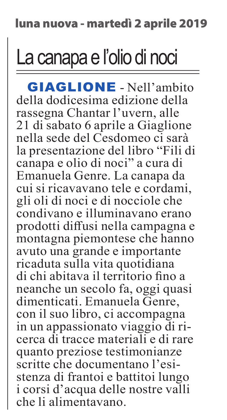 "Chantar l'Uvern" con fili di canapa e olio di noci