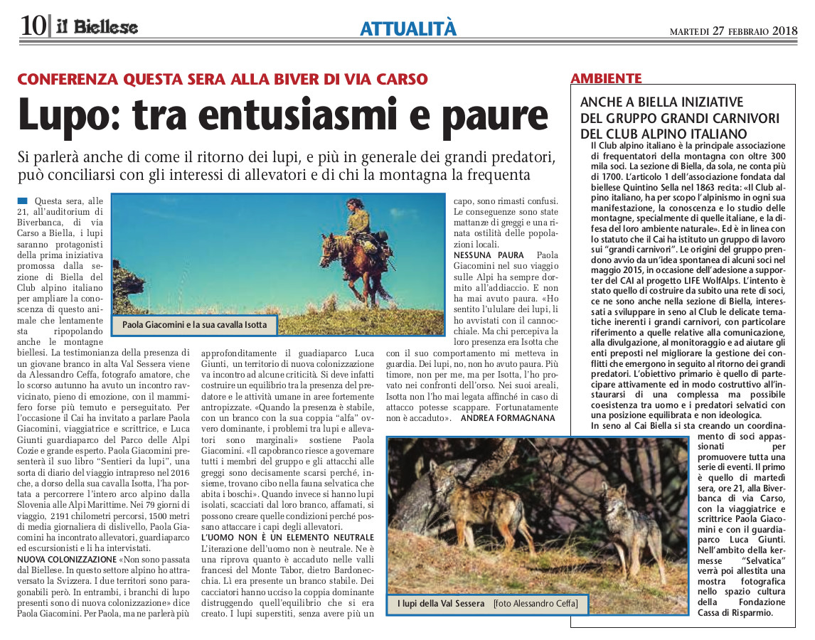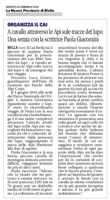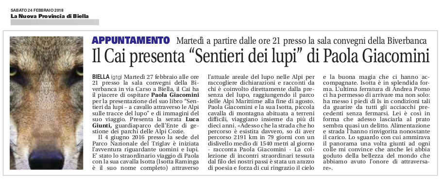 A cavallo attraverso le Alpi sulle tracce del lupo Una serata con la scrittrice Paola Giacomini