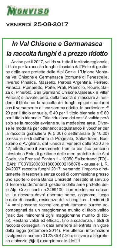 In Val Chisone e Germanasca la raccolta funghi è a prezzo ridotto