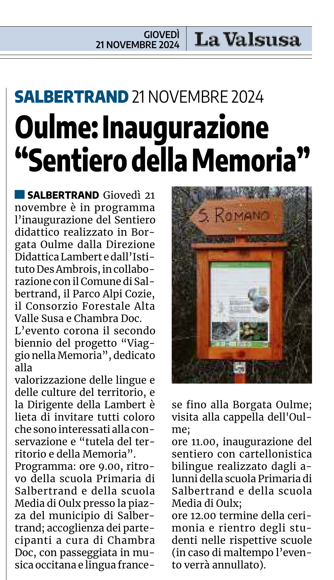 Oulme: Inaugurazione “Sentiero della Memoria”