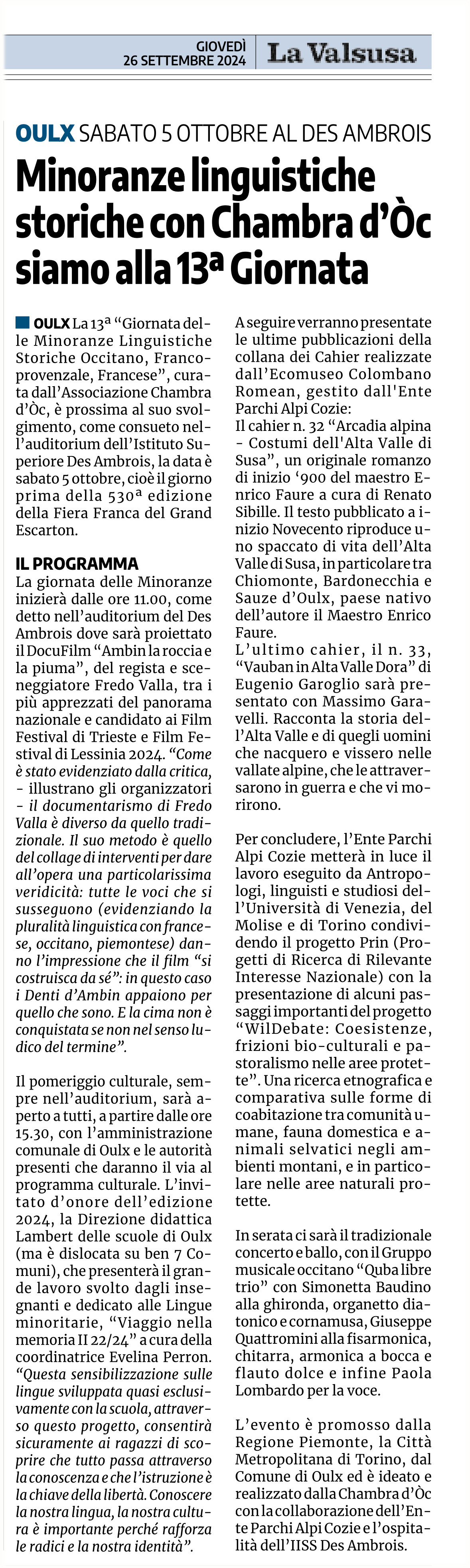 Minoranze linguistiche storiche con Chambra d’Òc siamo alla 13ª Giornata