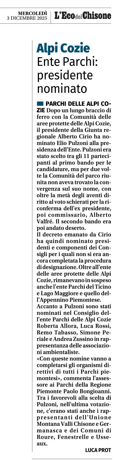 La Regione Piemonte ha nominato Elio Pulzoni Presidente delle Aree Protette delle Alpi Cozie