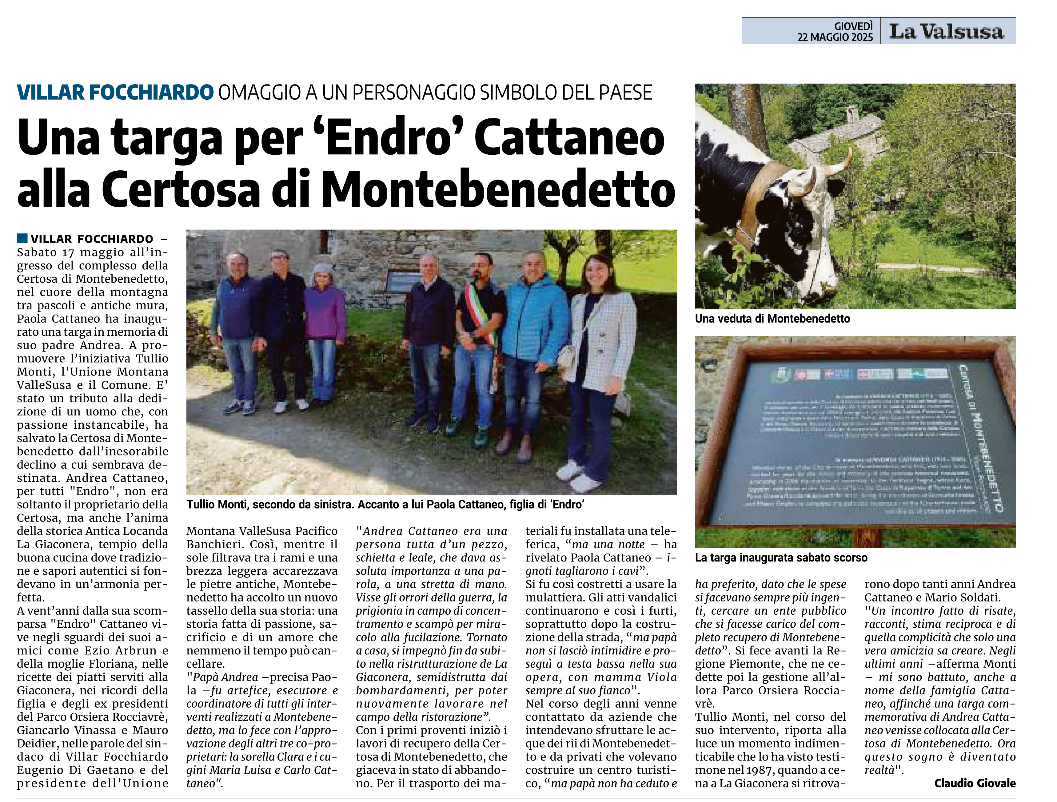 Una targa per ‘Endro’ Cattaneo alla Certosa di Montebenedetto